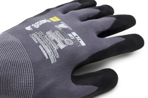 Szürke, varrás nélküli, poliamiddal megerősített, 15-ös kötésű kesztyű, tenyerén nitril mikro-habbal és pettyezve, kötött mandzsettával.